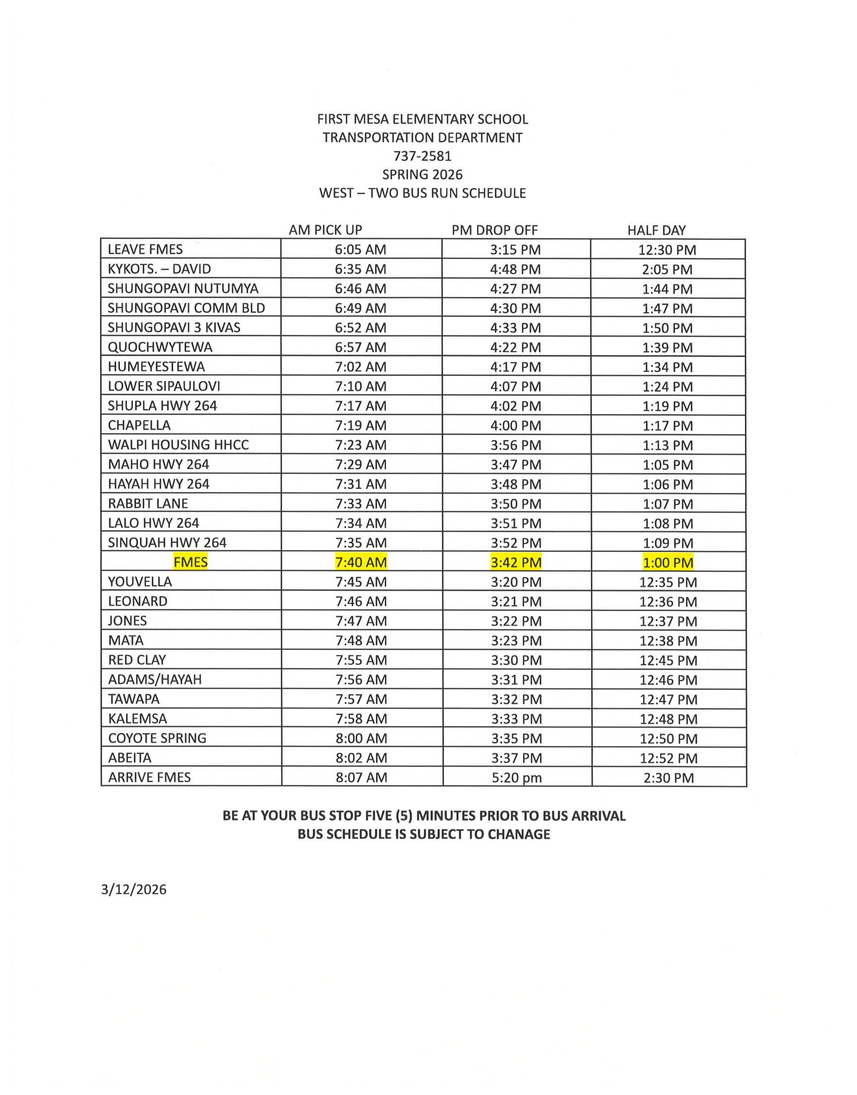 Please find the update bus schedule for the FMES Westbound riders. Updated August 22, 2025. Transportation Department.