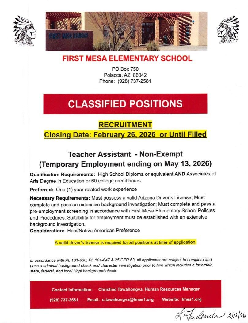 First Mesa Elementary School offers an exciting part time Temporary Employment opportnity. Click HERE for more information.