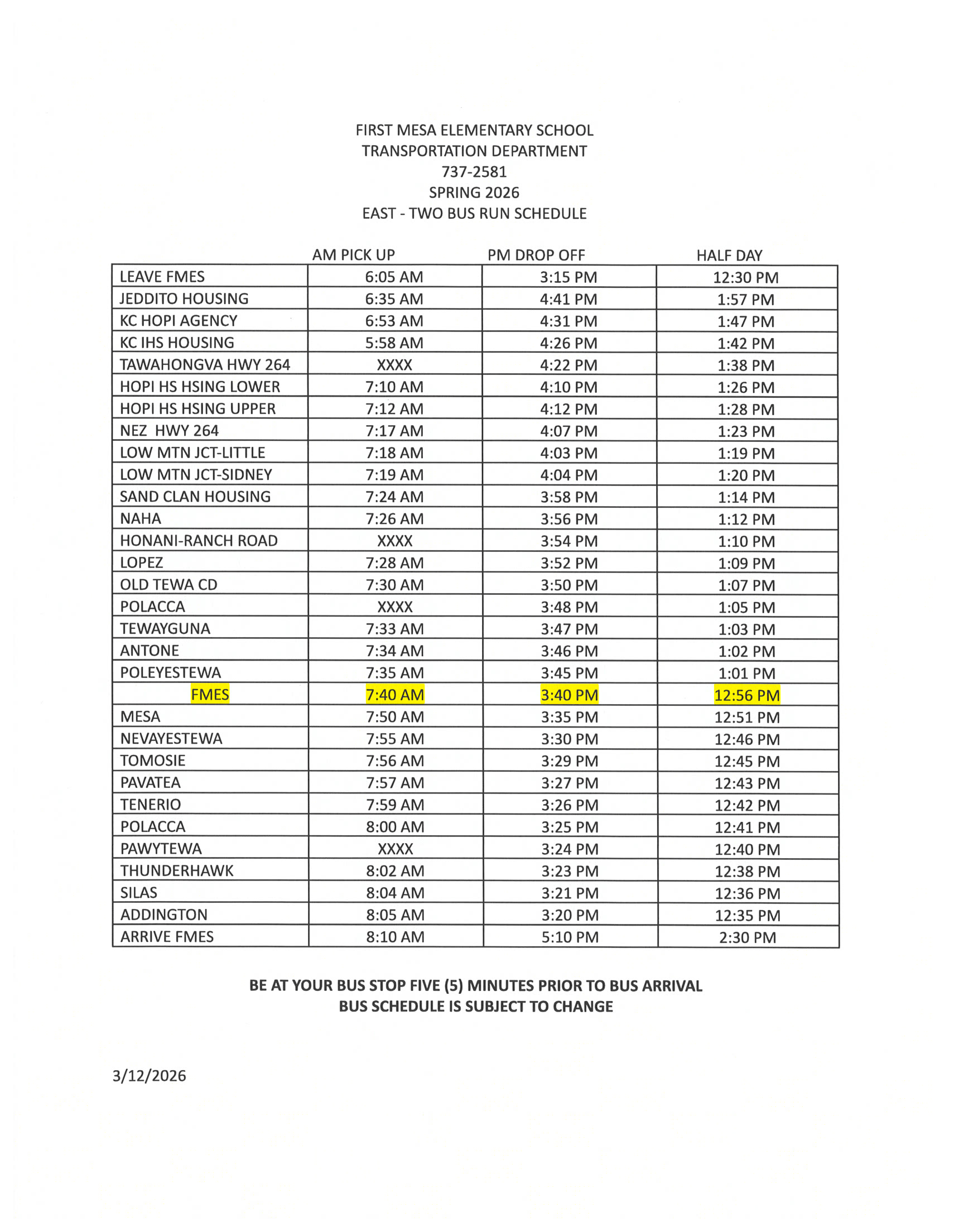 Reminder please be at your pick up location 5 minutes prior to pick up time. FMES is requesting Kindergarten students be accompanied for bus pick up and afternoon drop off.